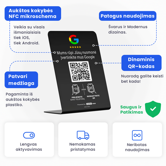 Nepraleisk progos surinkti daugiau atsiliepimų iš savo klientų! Vienu prisilietimu arba nuskenavus QR kodą nukreipk juos tiesiai į atsiliepimų puslapį – greita ir paprasta.